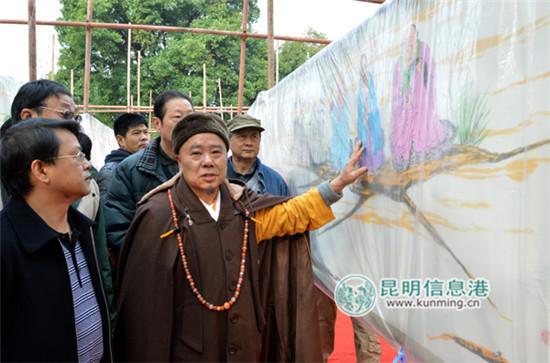 资料图:持忠法师带红河州委宣传部长伍皓参观画卷记者林坚/摄