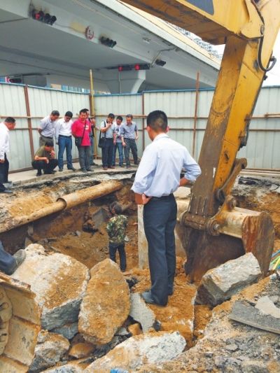 中午12时40分许,几位专家来到现场。站在坑边,有专家向现场人员询问坑内的两根管道和一段彩线是哪个单位的?随后,现场人员表示两根圆管均是废弃的雨污水管,而彩色电线则是路口信号灯的控制线,不过也已废弃。绕圈一周后,专家匆匆离开。专家在场时间约10分钟。