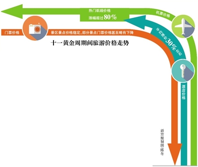 十一黄金周进入倒计时,记者从多家旅游机构了解到,今年十一黄金周期间,机票、酒店、跟团游的价格较平日均价普遍上浮30%左右。携程相关负责人告诉记者,9月30日、10月1日出发的线路价格最高,10月5日、6日后开始回落,建议游客错峰出游。