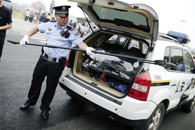 天安门广场周边巡视的防暴处突车辆及其装备昨日现场亮相,据警方介绍,每辆处突车上大约有10件左右装备,其中包括防刺背心、盾牌、警戒线、约束带等常用装备,另外还增配了一些“新武器”。