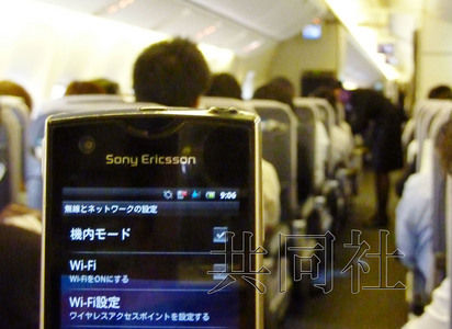 大阪机场一架全日空客机上,乘客在舱内使用设成“飞行模式”的智能手机