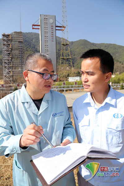 车著明(左)在西昌发射场区工作现场。周震摄 西昌卫星发射中心供图