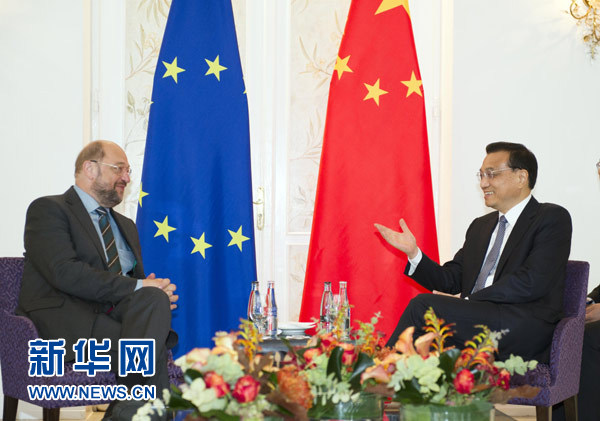李克强指出,中国高度重视发展同包括欧洲议会在内的欧盟机构的关系,愿与欧方加强互信,深化合作,扩大共同利益,通过对话与协商解决分歧。我期待不久后在米兰出席第十届亚欧首脑会议期间,同欧洲理事会主席范龙佩、欧盟委员会主席巴罗佐举行会晤,回顾过去,展望未来,推动中欧全面战略伙伴关系取得新发展。期待欧洲议会继续为此发挥积极作用。