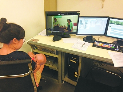 赵菲菲在导播室给孩子喂奶。