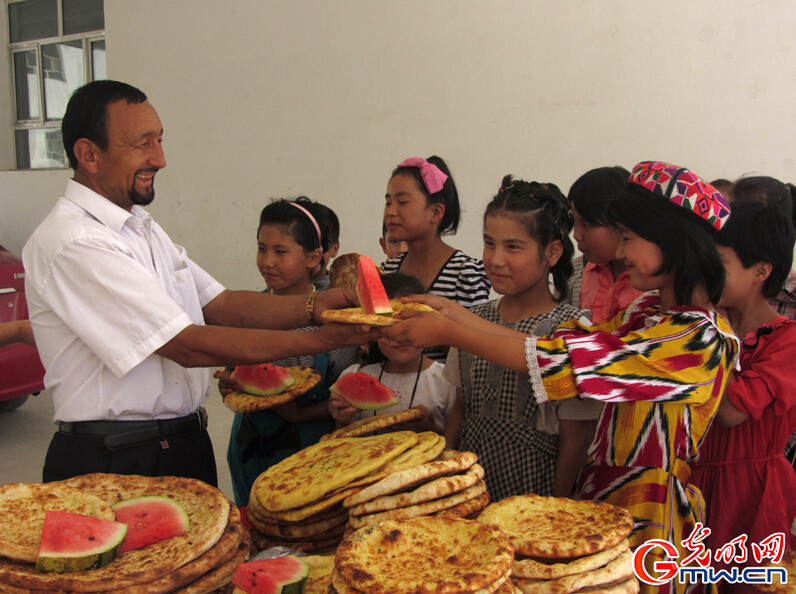 又到了新疆阿克苏市依干其乡中学中午放学的时间,许多学生迅速跑到学校大门,眼巴巴地望着远方。当那辆熟悉的三轮车出现在他们眼里时,顿时响起一片喊声:“爸爸来了,爸爸来了。” 这位被学生们喊作“爸爸”的老人,听到这亲切的声音,脸上露出了灿烂的笑容,赶忙将车上的馕一一分发给他们。那一刻,温情的画面充满学校,老人和学生沉浸在快乐与幸福之中。