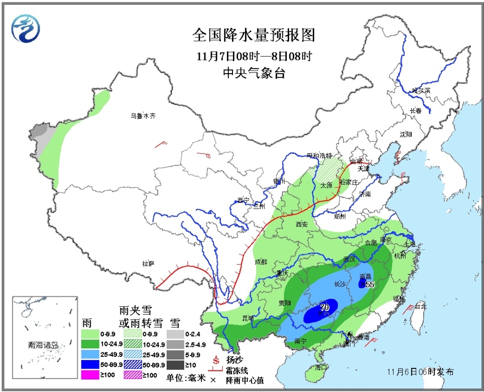 7日08时至8日08时,新疆西部、山西北部等地的部分地区有小雪(雨)或雨夹雪,局地中雪;西北地区东部、西南地区东部和南部、山西中部、黄淮南部、江淮、江汉、江南、华南中西部等地有小到中雨,其中贵州东南部、广西西部和北部、湖南大部、江西中西部等地的部分地区有大雨,局地暴雨(50~70毫米)。台湾海峡、巴士海峡、南海北部有6~7级、阵风8级的东北风。