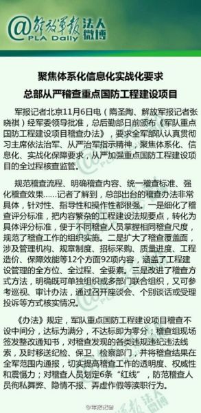 据《解放军报》法人微博“军报记者”消息,经军委领导批准,总后勤部日前颁布《军队重点国防工程建设项目稽查办法》,要求聚焦体系化、信息化、实战化保障要求,从严加强重点国防工程建设项目全过程核查监管。《办法》规定,军队重点国防工程建设项目稽查不设中间分,达标为满分,不达标为零分。