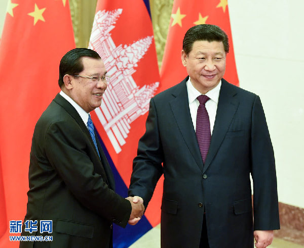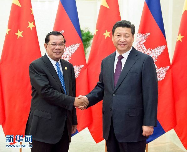 习近平欢迎洪森来华出席加强互联互通伙伴关系对话会。习近平指出,路遥知马力,日久见人心。中柬两国坚持做知心朋友和可靠伙伴,风雨同行,携手合作。这种传统友谊弥足珍贵,我们要坚定不移予以坚持和发展,使中柬关系不断向前发展,结成守望相助的命运共同体。中方支持洪森首相和人民党领导柬埔寨走符合本国国情的发展道路,将继续为柬埔寨经济社会发展提供帮助。中方愿意同柬方保持高层往来和党际交往,交流治国理政经验,推进互联互通、农业、水电、经济特区、教育、医疗、电信、旅游等领域合作,共同推进丝绸之路经济带和21世纪海上丝绸之路建设。中方支持加强两国人文和青年交流,使中柬友谊不断发扬光大。双方要在地区事务中加强沟通和协调,共同维护和促进中国-东盟团结合作。