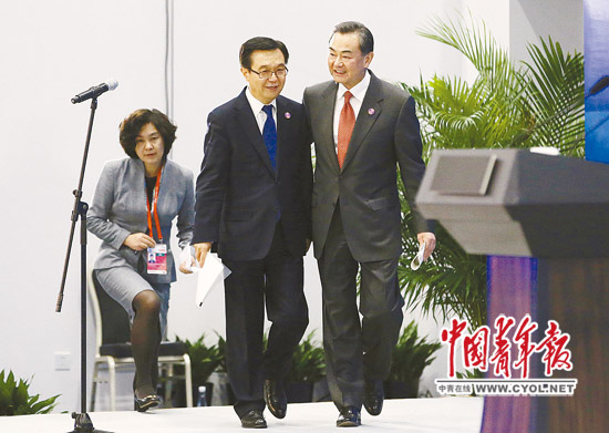 11月8日,北京国家会议中心,中国外交部部长王毅(右)和商务部部长高虎城并肩步入新闻发布厅。当日,王毅和高虎城在这里举行记者会,介绍APEC第26届部长级会议有关情况。记者 陈剑摄