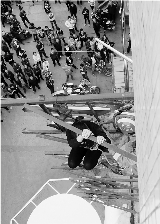 这时,一名消防官兵在做好防护措施后,爬出窗外来到该女子身边,用一根4米短绳与腰带将该女子固定牢,10时50分许,该女子被成功带至安全区域内,化解了险情。