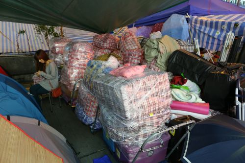 金钟中信大厦出入口范围外,原设有超过50个帐篷,供集会人士通宵留守,《大公报》记者昨日到场视察,发现该处的帐篷只剩下不足20个,似为减少清场时的损失。物资站的当值人数同样有减少之势,近红十字会的一个物资站,晚上近7时竟然空无一人。