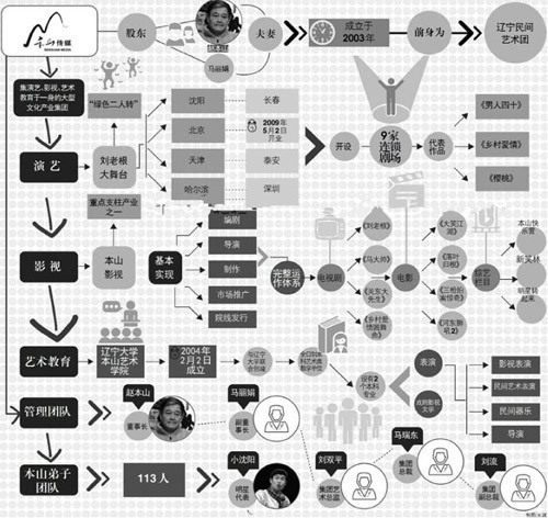 赵本山1993年成立本山艺术开发总公司,2005年将辽宁省民间艺术团升格成为本山传媒。目前本山传媒旗下还有本山影视、瑞东文化发展有限公司、辽宁大学本山艺术学院。与之相对应的是本山传媒的四大业务板块,演出、影视制作、电视栏目、艺术教育。