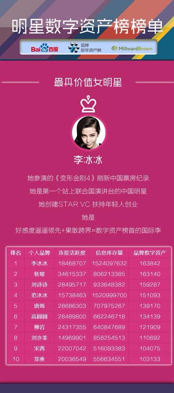 对于近年来国际化道路越走越顺畅,美誉度持续攀升的李冰冰来讲,上榜得奖并不出奇,但她还是直言对该榜单的特别青睐:“这是一个与众不同的榜单,在我上榜的数字资产背后,是亿万网友对我的认可与支持,是用最真实的数据直接地反馈网友的态度。想到这里,我感到特别激动。”让“数据”说话,是百度品牌数字资产榜的最大特点,也是其公信力的依托。和产品品牌一样,明星的数字资产也由两个指标构成:一个是信息库存量(=数字内容量×好感度),另一个是连接活跃度(=关注度×参与度×联想度)。数据选取时段为2014年1月1日-11月15日。