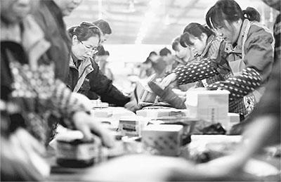 “双11”前夕,安徽合肥一快递公司的员工挑灯夜战分拣、整理快件。 杨晓原摄