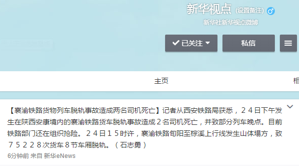 【襄渝铁路货物列车脱轨事故造成两名司机死亡】记者从西安铁路局获悉,24日下午发生在陕西安康境内的襄渝铁路货车脱轨事故造成2名司机死亡,并致部分列车晚点。目前铁路部门还在组织抢险。24日15时许,襄渝铁路旬阳至棕溪上行线发生山体塌方,致75228次货车8节车厢脱轨。(石志勇)