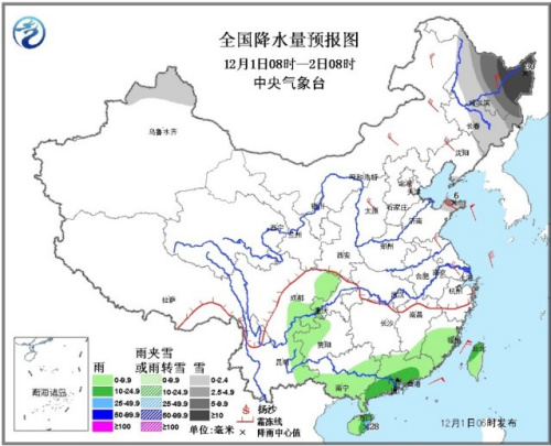 12月1日08时至12月2日08时,新疆北部、东北地区中北部、山东半岛、辽东半岛南部等地有小到中雪,其中,黑龙江中东部的部分地区有大到暴雪,局部大暴雪(20~30毫米);华南大部、西南地区东部的部分地区有小到中雨,局地大雨(25~28毫米)。内蒙古中东部、东北地区、华北、黄淮东部、江淮东部、江南东北部等地有4~6级风,山东半岛、辽东半岛有7~8级风。