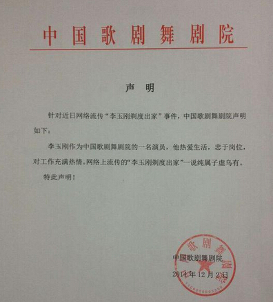 同事,中国歌剧舞剧院也对此次“出家”谣传发出郑重声明:“作为中国歌剧舞剧院的一名演员,李玉刚热爱生活,忠于岗位,对工作充满激情。网络上流传的‘李玉刚剃度出家’一说纯属子虚乌有。”
