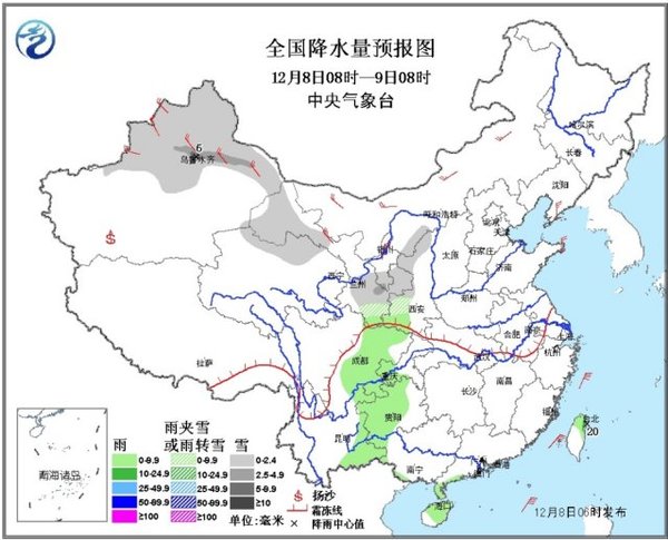 8日08时至9日08时,新疆北部、甘肃西部和南部、青海北部、陕西西部等地有小到中雪或雨夹雪,其中新疆沿天山中部的部分地区有大雪;西南地区东部、华南西南部、台湾中北部等地有小雨,局地有中雨。新疆北部、内蒙古中西部等地有4~6级风,山口地区风力可达8~10级。东海南部、台湾海峡、南海大部有7~9级风,台湾海峡、南海东部部分海域的风力可达8~9级、阵风10~11级,“黑格比”中心经过的附近海域风力可达10级,阵风11~12级。