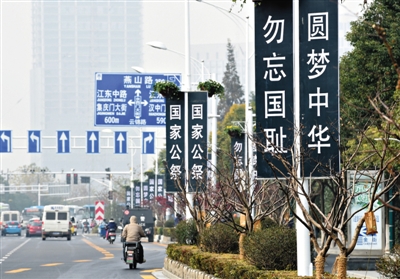 昨日,侵华日军南京大屠杀遇难同胞纪念馆建筑及附近道路上,布置了国家公祭日的主题标语牌。新华社记者孙参摄