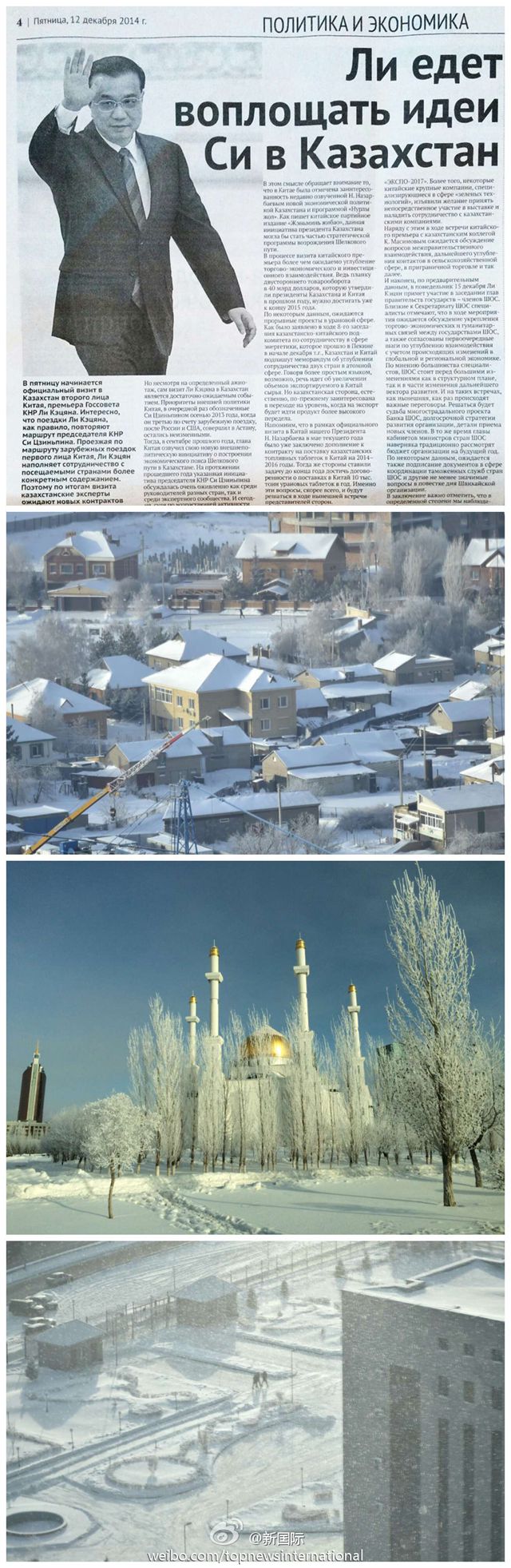 新华网北京12月13日电据新华社“新国际”微博报道,哈萨克斯坦首都阿斯塔纳冰天雪地,当地各界对李克强来访的期待却相当热切。总统府、总理府工作人员周末都在加紧筹备。哈通社记者穆卡诺夫说,中国总理来访对他们来说是大新闻,他和同事将全程报道。他很关心哈中合作,希望中国的发展和经验能帮助哈更好发展。