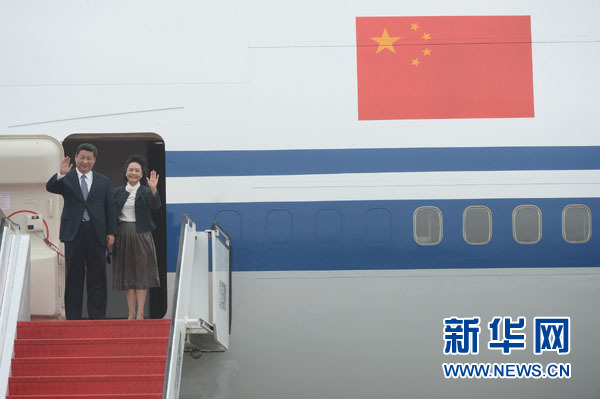 习近平主席和夫人彭丽媛走出机舱时向欢迎人群挥手致意。新华社记者张金加摄
