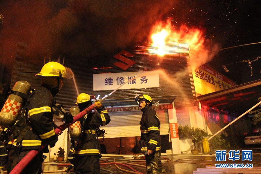 2014年12月19日福建厦门两家汽车4S店发生火灾致1死1伤12月19日凌晨,消防人员在福建厦门汽车4S店火灾现场灭火。当日,厦门市莲前西路两家相邻的汽车4S店突发大火,厦门消防支队接到报警后,迅速调派6个消防中队、120多名消防官兵赶赴现场扑救。截至凌晨3时,大火被扑灭。火灾造成几十辆汽车被烧毁,1人死亡,1人受伤。新华社发