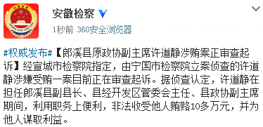 原标题:安徽郎溪县原政协副主席许道静涉贿案正审查起诉