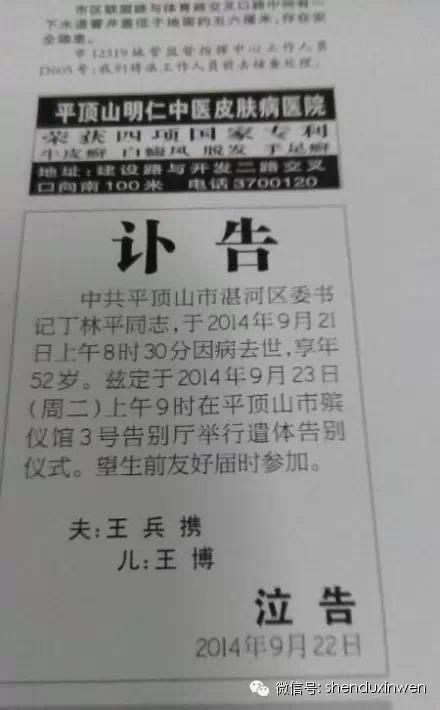 平顶山宣传系统一位工作人员认为不能说当地秘而不宣,因为当时平顶山报纸上刊登了讣告。南都记者看到了位于平顶山日报一个角落的讣告,中共平顶山市湛河区委书记丁林平同志,于2014年9月21日上午8时30分因病去世。