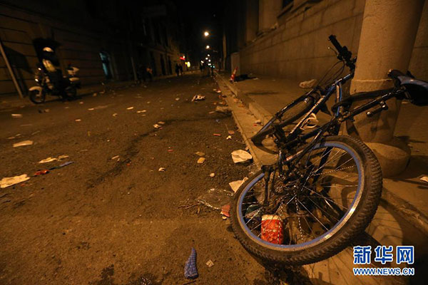 2015年1月1日凌晨,一辆自行车被踩坏的自行车被遗弃在上海外滩的路边。新华社记者 丁汀 摄
