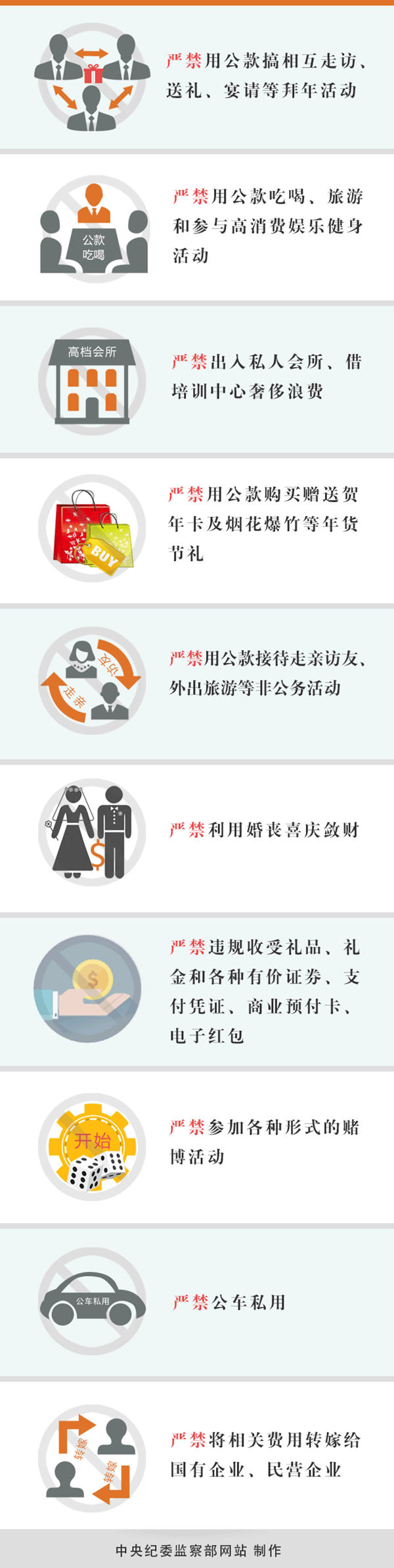 中共中央办公厅、国务院办公厅联合下发《关于做好2015年元旦春节期间有关工作的通知》,明确要求各级领导干部要持续深入反对“四风”,严格执行廉洁从政各项规定,坚决杜绝“节日腐败”,严禁以下十类行为。