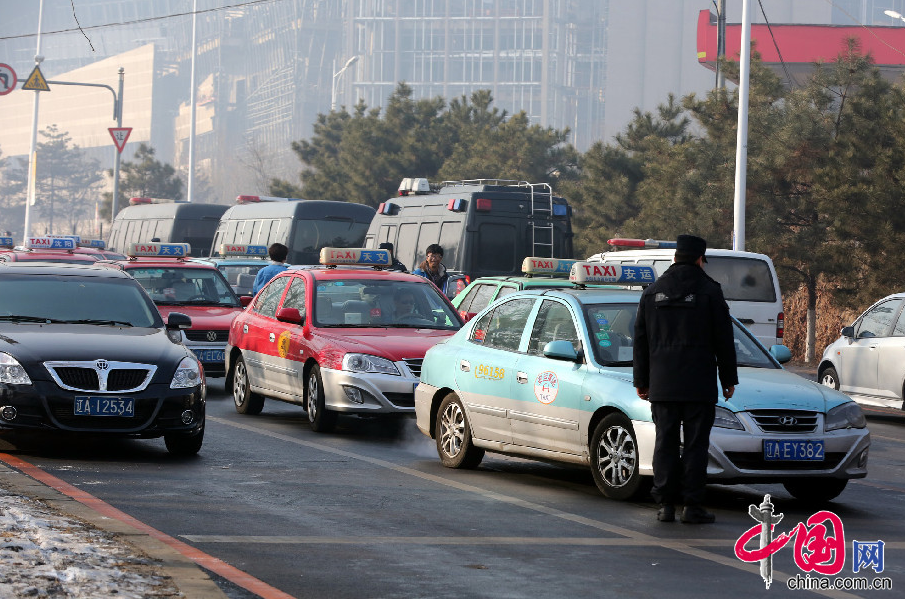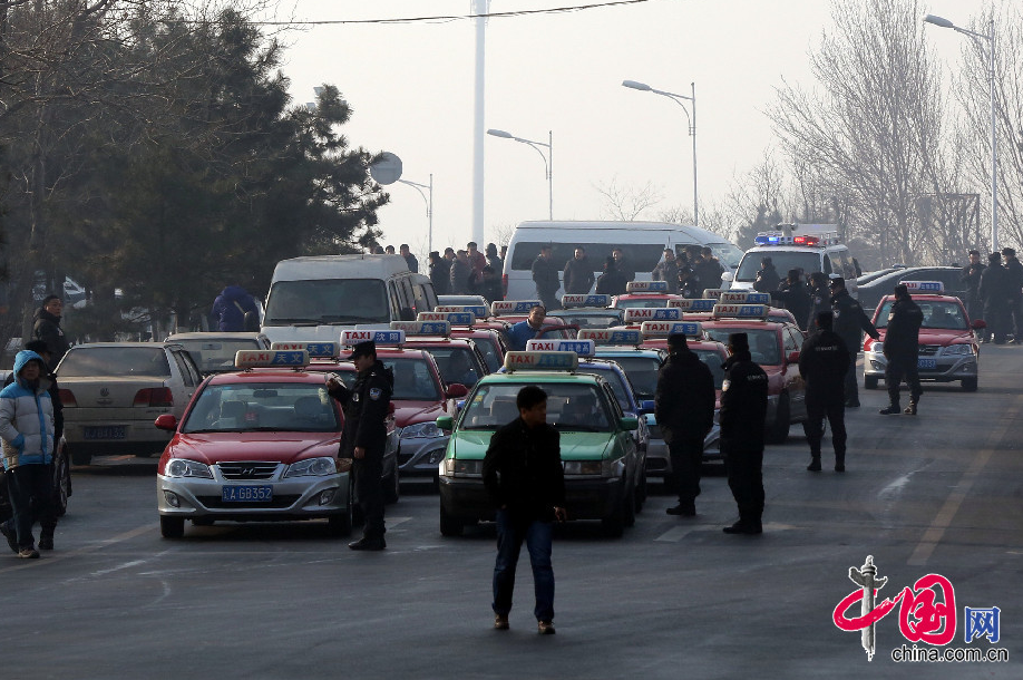 中国网1月4日讯2015年1月4日,辽宁省沈阳市,2015年首个工作日,沈阳数千台出租车集体罢运,表达不满,造成节后首个工作日不少上班族打不到车。交警联合特警在主要街道对准备游行车辆进行交通疏导。据悉,沈阳出租车司机罢运原因主要有:对“滴滴”专车、“快的”专车的兴起表达不满;黑出租、套牌出租相关部门整治力度不够;2015年1月1日起沈阳取消1元钱燃油附加费。