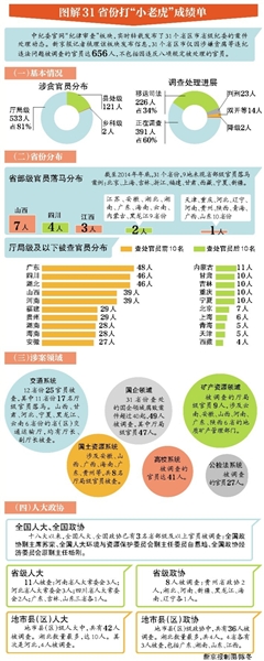 前日,中纪委“晒”出了年度反腐成绩单。十八大以来至2014年底,已结案处理或正在立案审查的中管干部99人。与中纪委打“大老虎”的力度相比,31个省份打“小老虎”的成绩单同样出色。初步统计,自十八大以来至2014年底,31个省份立案调查的厅局级及以下官员达656人。