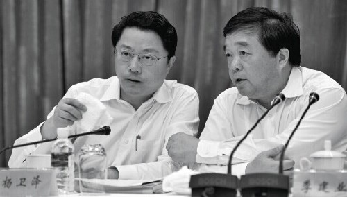 南京市原市长季建业落马14 个月后,南京市委书记杨卫泽也因涉嫌违纪违法,接受组织调查。图为2012 年杨卫泽(左)和季建业(右)参加南京市“两会”。