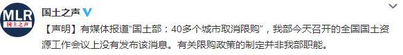 国土资源部官方微博“国土之声”15日晚间发布声明称:有媒体报道“国土部”:40多个城市取消限购”,我部今天召开的全国国土资源工作会议上没有发布该消息。有关限购政策的制定并非我部职能。