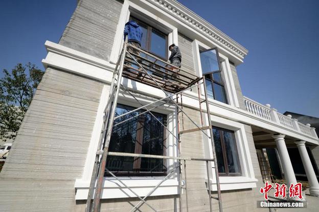 1月19日,工人正在3D打印别墅外部进行施工。 中新社发王思哲摄