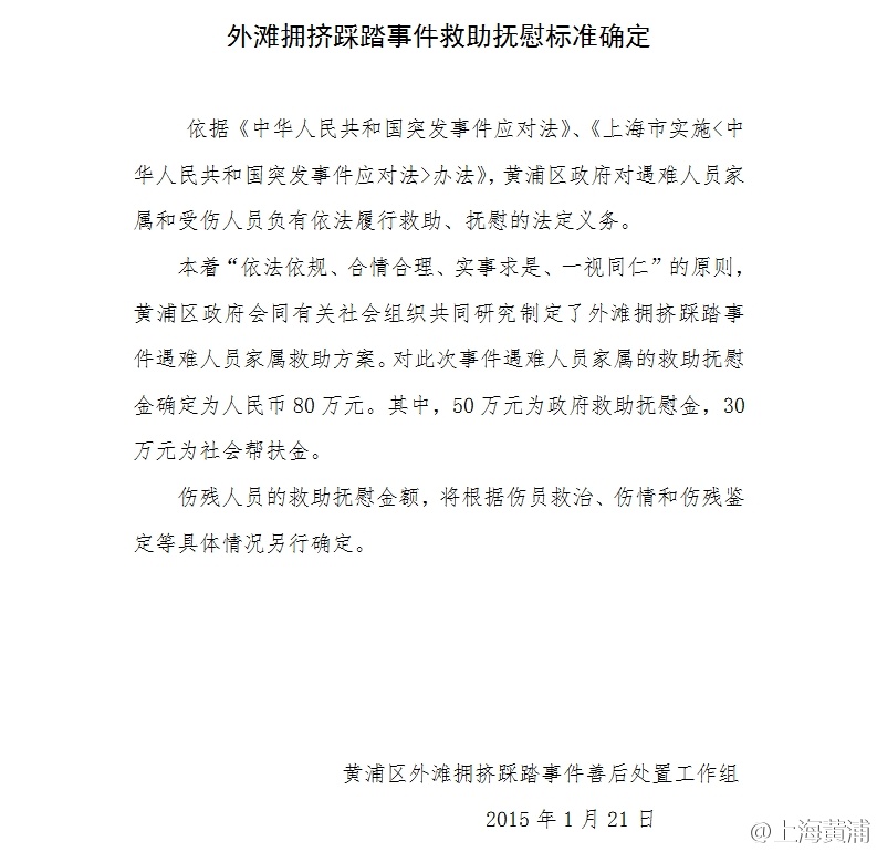 【外滩拥挤踩踏事件救助抚慰标准确定】本着“依法依规、合情合理、实事求是、一视同仁”的原则,黄浦区政府会同有关社会组织共同研究制定了外滩拥挤踩踏事件遇难人员家属救助方案。