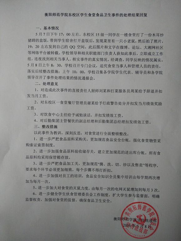 5月8日,在衡阳师范学院贴吧一篇题为《衡阳师范学院东校区学生食堂食品卫生事件的处理结果回复》文章称,“学校领导和相关职能部门负责人获知此事后,立即成立工作组,连夜找到相关当事人,核实事件的真实情况。经调查,同学反映的情况属实”。