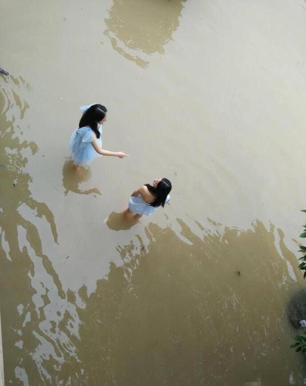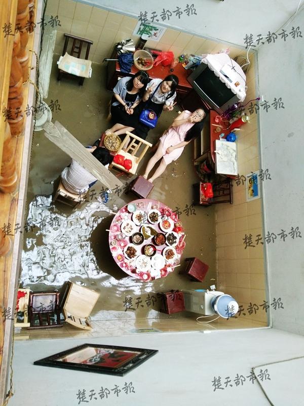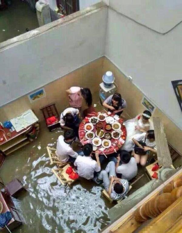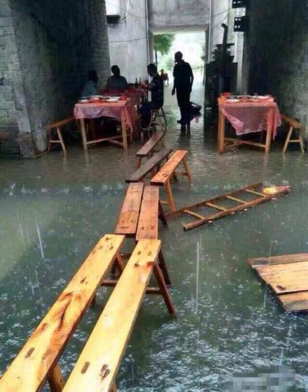 水有三四十厘米深,大家跷着腿吃完了饭。