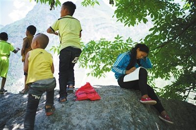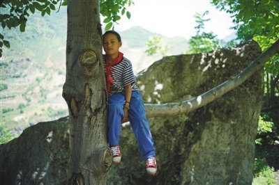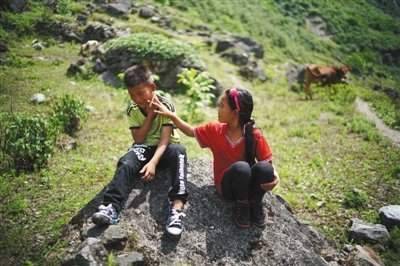 弟弟妹妹们有时会到石头上找大姐,他们同样会脱掉鞋子,光着脚丫爬树,或在石头上跳来跳去。陈日莫,7岁,学前班。家里最害羞的孩子,即使在家也要戴着红领巾。