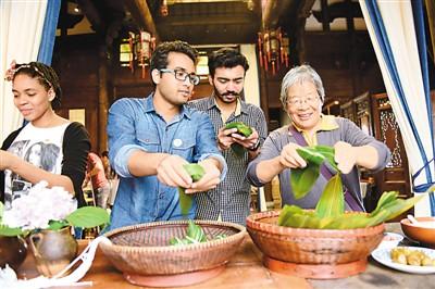 把粽叶对折成圆锥形的斗,糯米和肉放进斗里与斗口基本相平时,再把粽叶往下折封住斗口,最后用棉线拦腰捆紧系好……这些天,在浙江金华开发区汤溪镇寺平村内,不少住在“家+”民宿的老外,饶有兴趣地和中国大妈们一起包粽子,体验中国端午的民俗魅力。