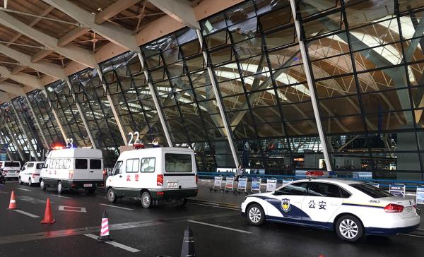 浦东机场T2航站楼前,停满了公安,武警车辆。澎湃新闻记者 朱伟辉 图