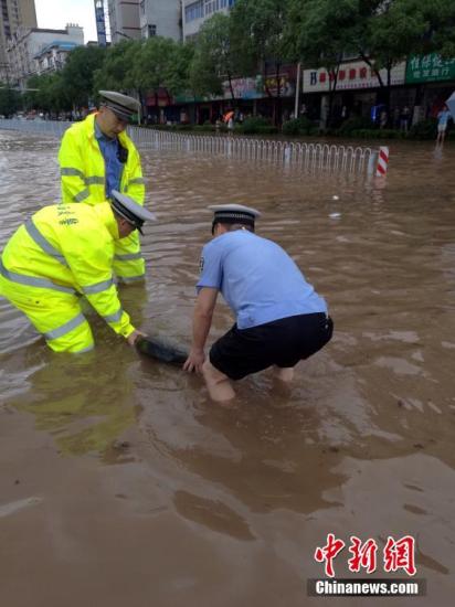 为了避免过路行人及车辆不慎掉落,交警站在井盖处守候,直到将井盖找到并安放好。 黎海滨 摄