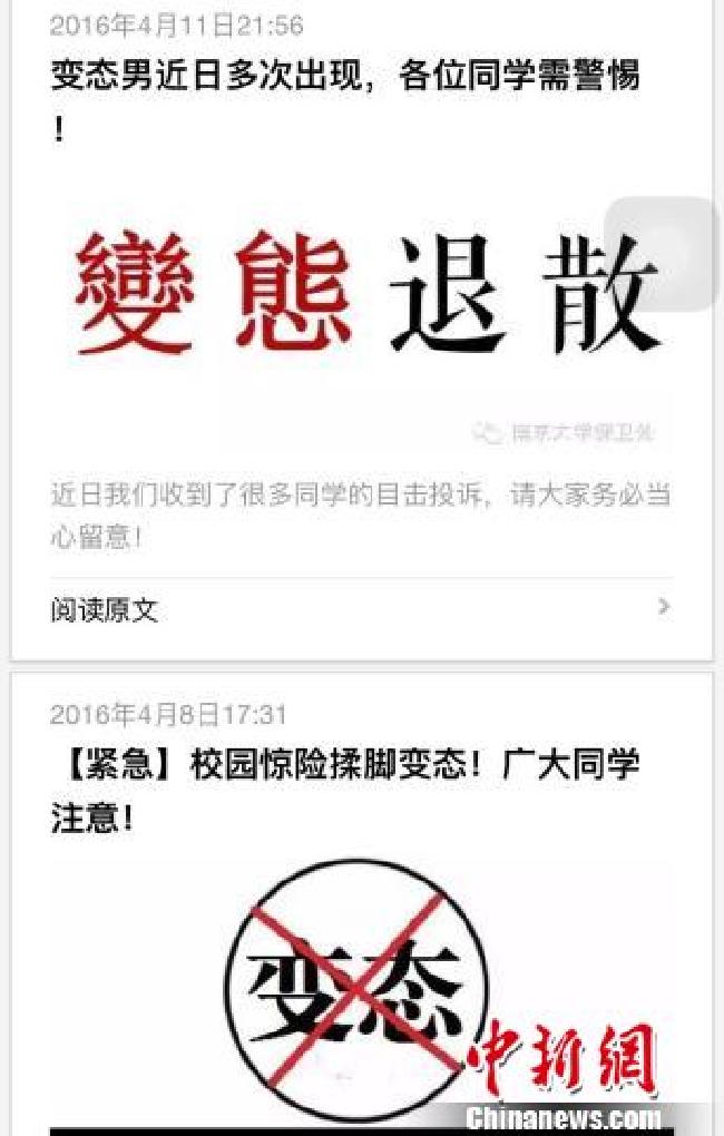 ▲今年4月,南京大学保安处官方公众号,曾两次发文提醒同学,注意校园变态骚扰。网络截图 摄