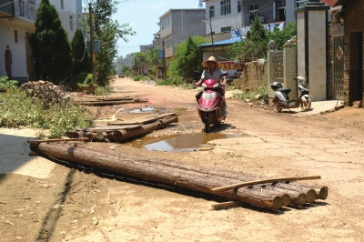 洪水消退,马路上还有村民自制的木筏。