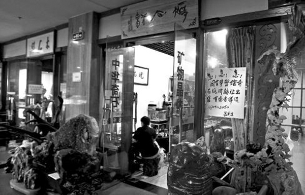 在负一层,曾经以赌石为由头的几家赌石店,也没有以往挑石的顾客,店老板趴在桌子边上睡觉,多家珠宝店更是没有一个人,几家店里只有一个人帮着看柜台。帮忙看店的张老板,一边泡着茶一边听着戏,谈起自己的生意,张老板伸了伸脖子,指着一片柜台说,“生意好的话咋能没个人影?”。