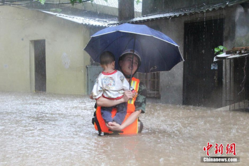 资料图:7月1日,湖北麻城遭遇特大暴雨袭击,导致该市境内多地山洪暴发、河水陡涨、民房进水、房屋倒塌、农田冲毁,公路、水利、通讯、电力等基础设施损毁严重。灾情发生后,消防、武警等多方力量展开救援。图为救援人员在麻城一村庄转移被困人员。 刘烨 摄