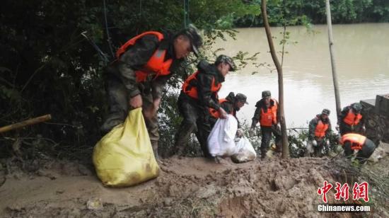 7月4日上午,安徽省庐江县乐桥镇段防护堤发生决口,武警交通第八支队三大队十中队出动40名官兵赶赴现场,经过连续8小时的奋战,填装沙袋3200余袋,顺利将缺口封堵。中新社记者 郭北顺 摄