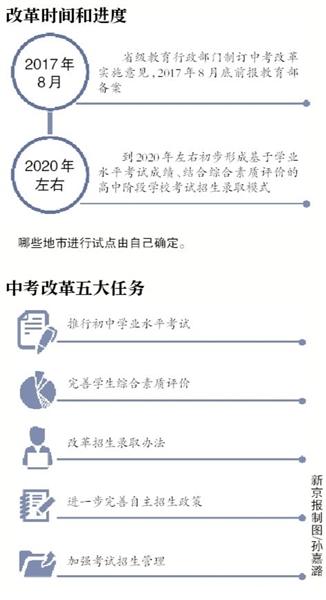 根据安排,省级教育行政部门负责制订中考改革实施意见,并于2017年8月底前报教育部备案。同时,综合改革试点将从2017年之后入学的初中一年级学生开始实施,目前初中在校生、非试点地市仍执行原来的考试招生办法。