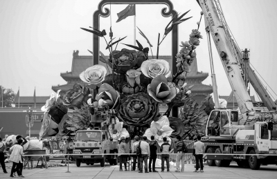 今年国庆节期间,17米高的“祝福祖国“花坛将再现天安门广场。昨天下午,记者来到天安门广场,看到十几位施工人员正在扦插花盘上的仿真花。