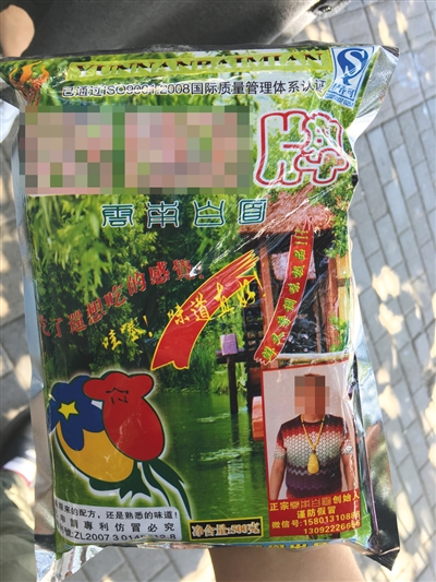 在确定需要购买时,该商贩从一个商铺中拿来一个棕色纸袋,“就在里面”。纸袋里面,是一种名为“云南白面”的调料,重量在500克,在其包装袋背面,显示主要成分标注为“香辛料、大香果、复合调味料”,同时标注原料产于老挝、泰国、缅甸和我国云南边陲,并称有一种“吃了还想吃的感觉”。